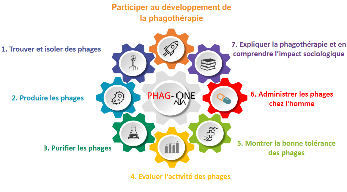 La phagothérapie est un traitement utilisant des virus, appelés bactériophages, capables de s’attaquer spécifiquement aux bactéries et de les détruire avec une totale innocuité pour les cellules humaines. Le projet PHAG-ONE fait partie des 11 projets retenus dans le cadre de l’appel à projets « Antibiorésistance : comprendre, innover, agir » piloté par l’Agence Nationale de Recherche (ANR). Ce programme prioritaire de recherche a été lancé par le gouvernement, sous l’égide du Secrétariat Général pour l’Investissement et l’ANR, dans le cadre des Programmes d’Investissement d’Avenir.