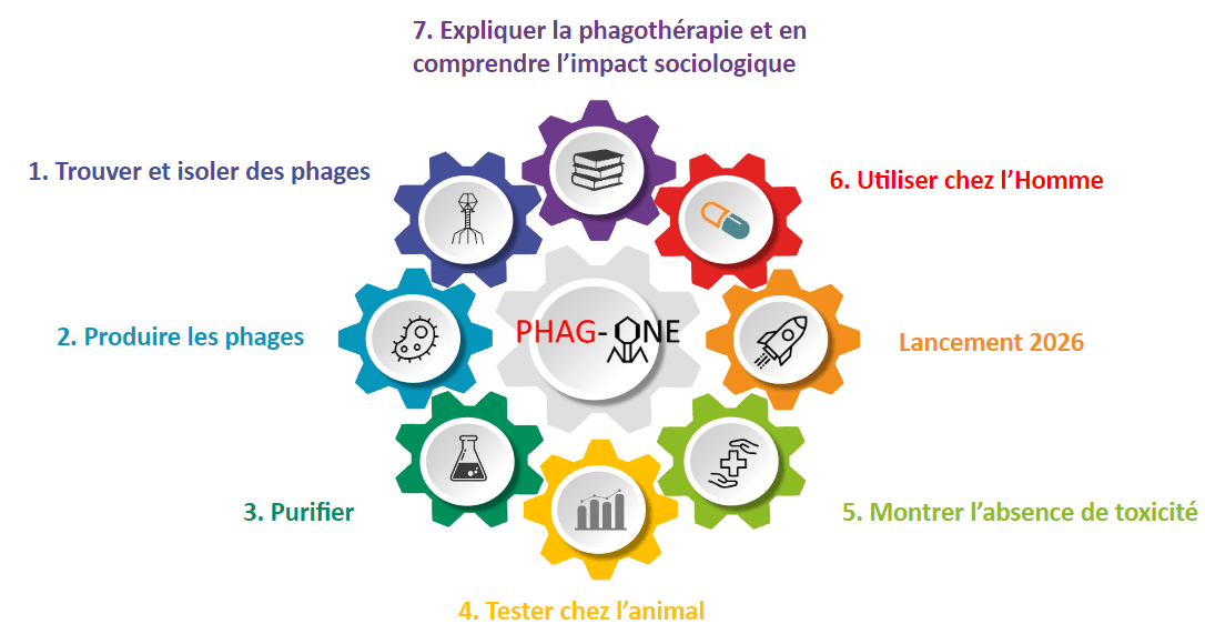 Phage therapy is a treatment using viruses, called bacteriophages, able to attack specifically bacteria and to destroy them with complete harmlessness for human cells. The PHAG-ONE project is one of the 11 projects selected as part of the call for projects "Antibiotic resistance: understand, innovate, act" led by the National Research Agency (ANR). This priority research program was launched by the government, under the aegis of the General Secretariat for Investment and the ANR, as part of the Future Investment Programs