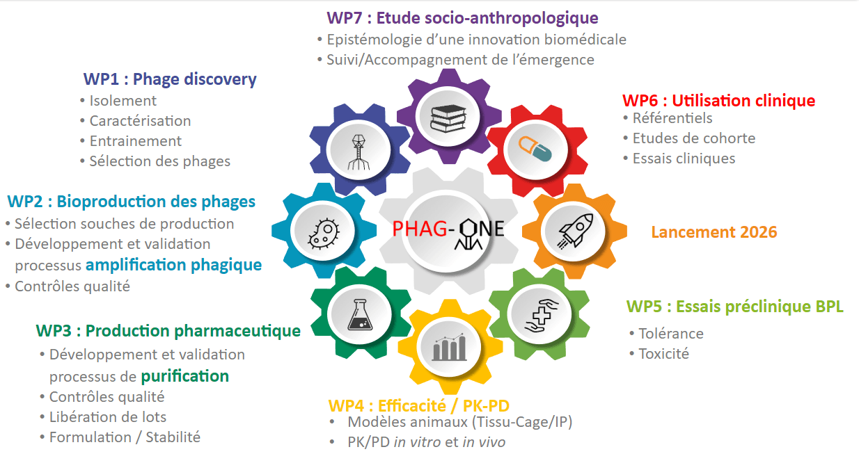 Phage therapy is a treatment using viruses, called bacteriophages, able to attack specifically bacteria and destroy them with complete harmlessness for human cells. The PHAG-ONE project is one of the 11 projects selected as part of the call for projects "Antibiotic resistance: understand, innovate, act" led by the National Research Agency (ANR). This priority research program was launched by the government, under the aegis of the General Secretariat for Investment and the ANR, as part of the Future Investment Programs.
